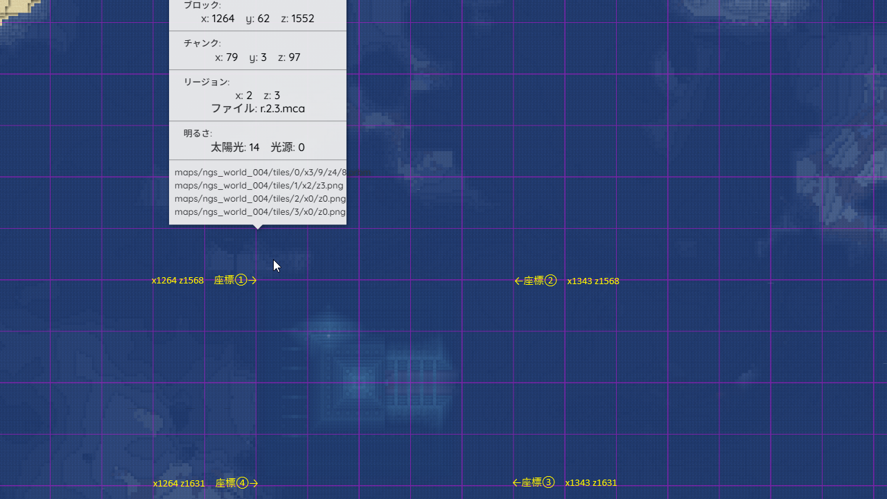 - 事前準備として、初期化したいチャンクの座標4点をメモします。クリックすると当該座標が表示されます。